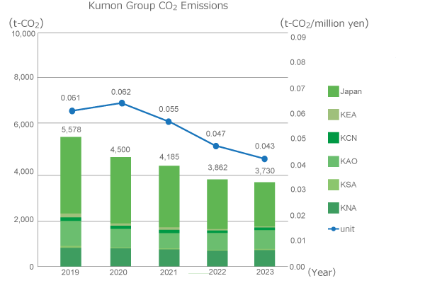 Compared to FY2022, the Kumon Group as a whole reduced CO2emissions by 3.4% in FY2023, and by 9.5% per unit of sales (CO2emissions/Net sales).