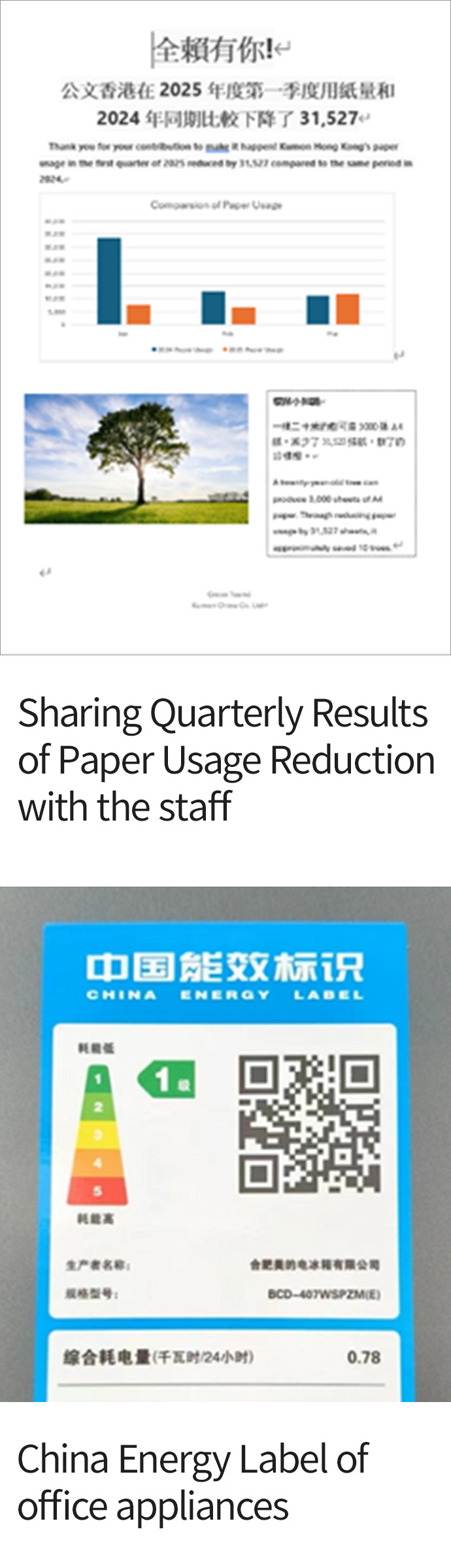 At our Beijing office, we reduced electricity consumption by replacing office equipment with more energy-efficient products during our relocation. The Shanghai office is promoting air circulation with fans to save energy. The Guangdong office is implementing similar energy-saving measures, with staff making efforts to reduce unnecessary consumption by turning off lights and air conditioners. These measures significantly reduce our environmental impact.