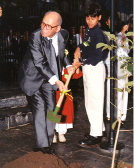 Toru Kumon planting a tree in commemoration of the opening of the Kumon South America head office building in August 1994.