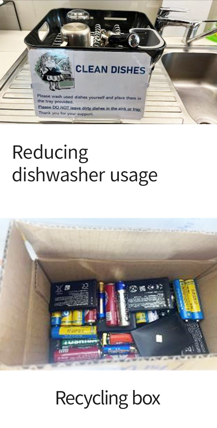 With more staff working from home and fewer in the office, the use of dishwashers has decreased. Baskets were installed in sinks to collect rinsed dishes, which led to a reduction in dishwasher use from five days a week to one. This change has resulted in a 20% reduction in electricity and water consumption. Because one cycle consumes approximately 3 kWh, reducing the use from five cycles to one per week results in weekly energy savings of 12 kWh, or 600 kWh annually.